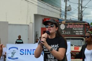A manifestação fez uma parada em frente à Prefeitura Municipal para exigir do poder público ações que acabem com o feminicídio, com o assédio nos espaços profissionais e que melhorem a assistência às mulheres, como investimentos no Centro de Referência da Mulher Albertina Vasconcelos (Crav), abertura de mais creches, melhor remuneração para os trabalhadores da educação, apoio para que a Delegacia Especializada no Atendimento à Mulher (DEAM) funcione por 24h, entre outras pautas. “Este momento é de união, para que nenhuma mulher fique sozinha, sofrendo as violências da sociedade. Sabemos que a questão da educação municipal e das creches está diretamente ligada com a inserção da mulher no mercado de trabalho. Sem elas a mulher não tem com quem deixar os filhos, não possui renda e se torna refém. O momento é união, de solidariedade e se mexer com uma, vai mexer com todas”, afirma Ana Cristina Novais, presidente do Sindicato do Magistério Municipal Público de Vitória da Conquista.