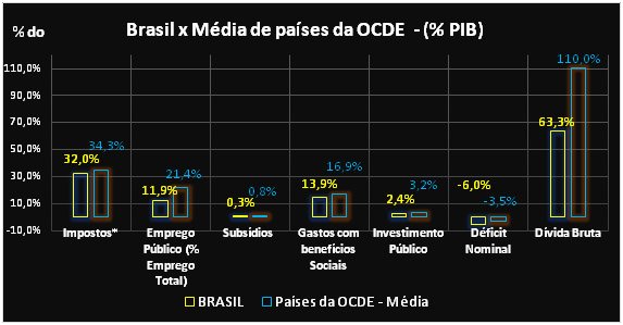 Entretanto, os dois últimos indicadores do gráfico são preocupantes. Primeiro, o déficit nominal (que inclui a despesa com juros) foi muito maior no Brasil (-6,0 % do PIB) do que na média dos países da OCDE (-3,5%). Não é de se espantar que naquele mesmo ano o governo gastou 45,1% de todo o orçamento efetivamente executado (R$ 978 bilhões) com juros e amortizações da dívida pública. Esta, apesar de estar aquém da média dos países da OCDE (63,3% contra 110,0%), exibe uma trajetória alarmante (os dados do relatório são de 2014. Em 2016, a dívida bruta brasileira atingiu 71,6% do PIB, com projeção de sucessivas altas, e o déficit nominal, 8,9% do PIB).
