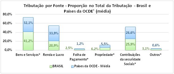 Tributação progressiva e políticas fiscais redistributivas não são questões de estrutura do Estado, mas sim de escolha política. A maior parte da carga tributária brasileira (41,2%, contra 32,1% da média de países da OCDE) provém de impostos sobre bens e serviços. Nesse sentido, proporcionalmente, os mais pobres pagam mais. De acordo com estudo do IPEA, quem ganha até 2 salários mínimos arca com uma carga tributária efetiva de 53,9%, enquanto que essa cifra para quem ganha mais de 30 salários mínimos é de 29,0%. Por outro lado, a tributação sobre Renda e Lucro no Brasil (20,9% do total) está muito aquém da média dos países da OCDE, que é 33,9% (vide gráfico abaixo). Isto se deve em grande parte à isenção de imposto para dividendos, umas das principais fontes de renda para os mais ricos cuja tributação só inexiste no Brasil e na Estônia, considerando todos os 34 países da OCDE. A injustiça tributária no Brasil vai muito além disso: baixas alíquotas para impostos sobre herança, isenção de IPVA para lanchas, iates, jatos e helicópteros, baixa tributação sobre latifúndios etc.